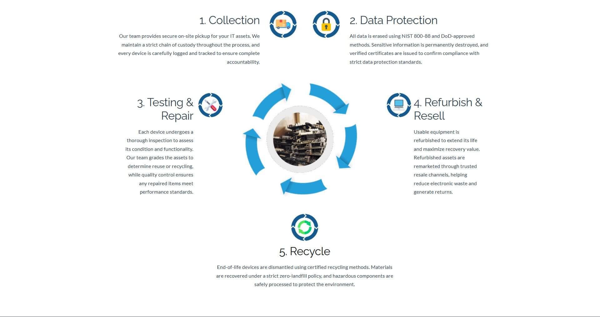 Our electronic recycling process keeps your data safe and meets all regulations. From pickup to final report, we handle your devices responsibly, recovering materials and ensuring transparency at every step.